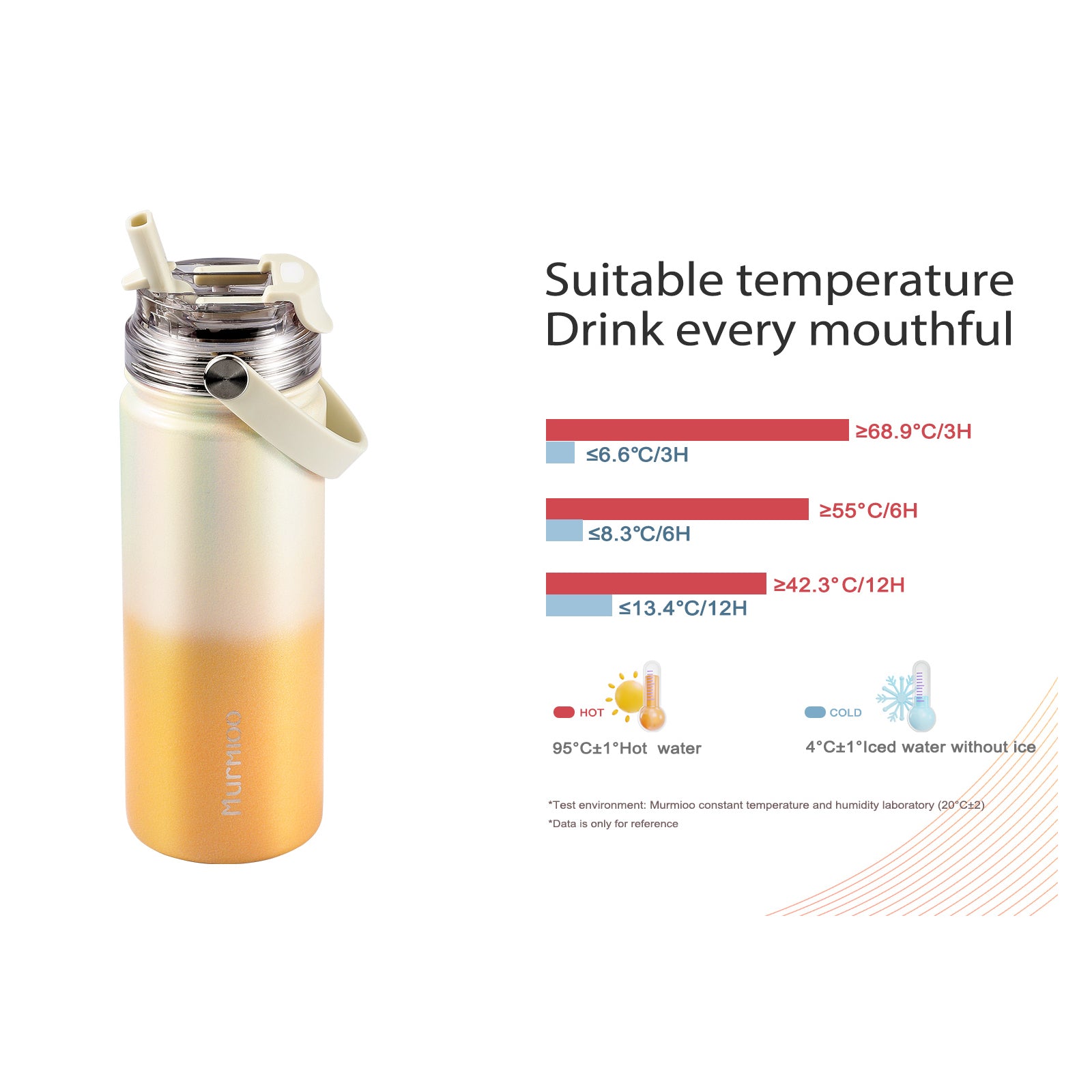 • Performance: Murmioo insulated sports water bottle is made of 18/8 food grade stainless steel. Double wall, vacuum insulation, anti-oxidation, anti-rust, anti-corrosion, BPA free, sweat proof! Stray color polish.