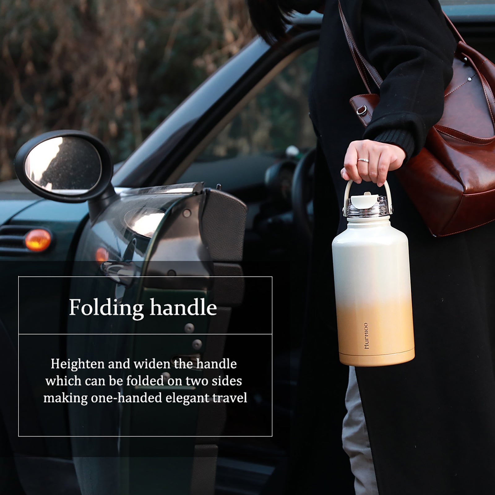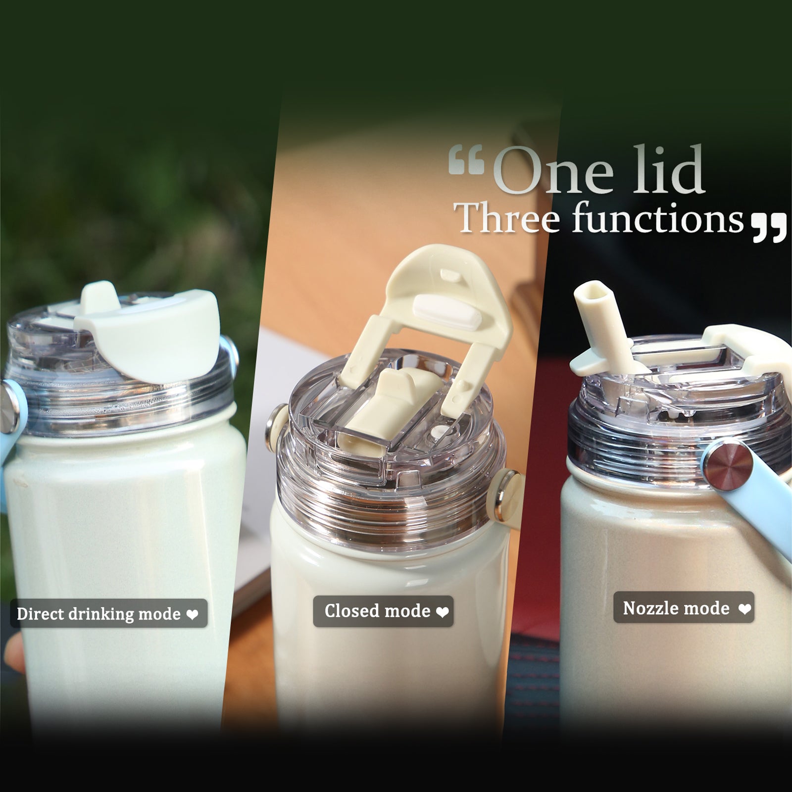 • Design: Our water bottle's unique 2-in-1 lid allows you to drink straight from the drinking bottle and use the straw lid to drink cold drinks. When you drink from the flip lid, you don't have to worry about the flip lid falling off and hitting your nose. We took the two most common drinking methods and put them on the lid. Keeps cold for 12 hours and hot for 12 hours. One bottle is enough!
