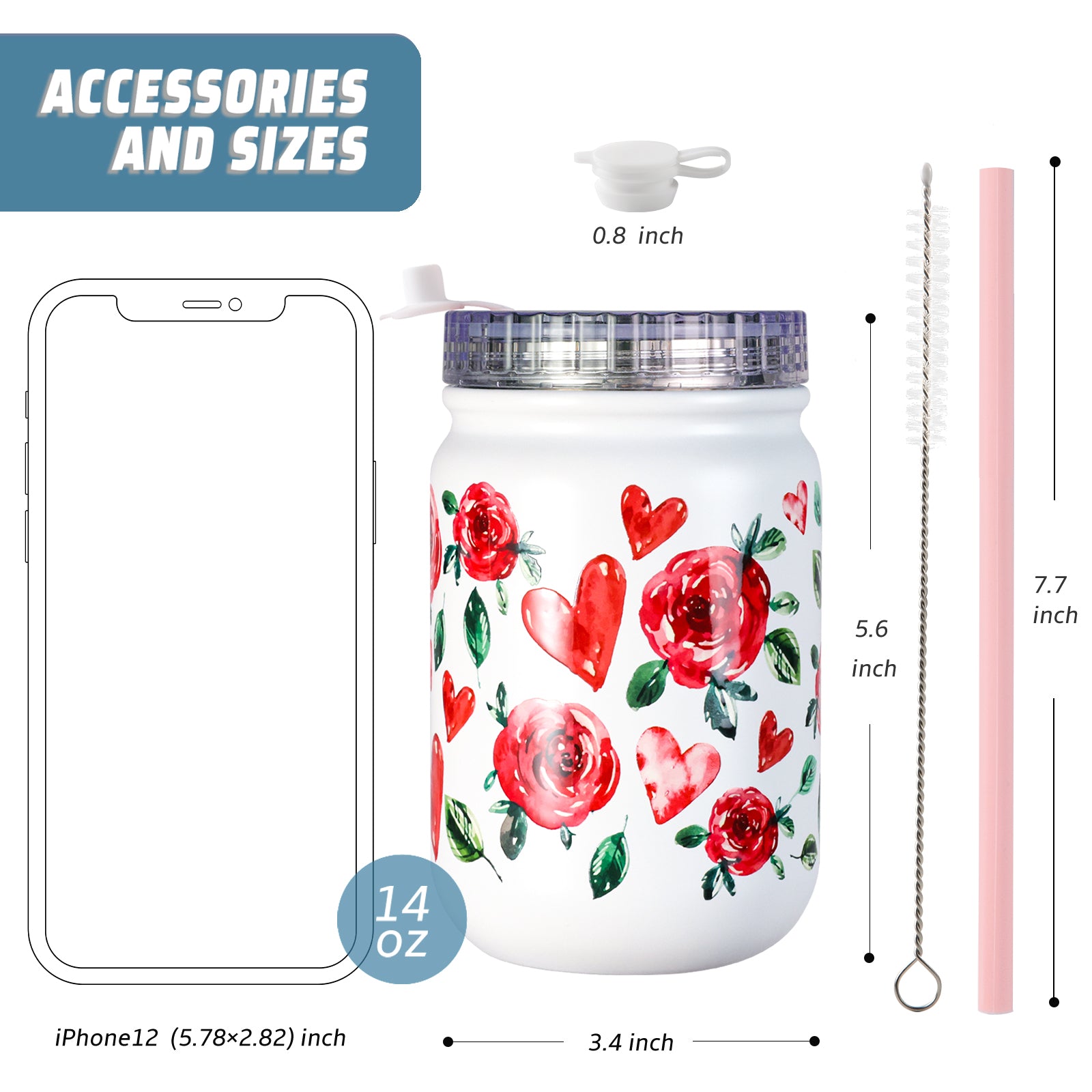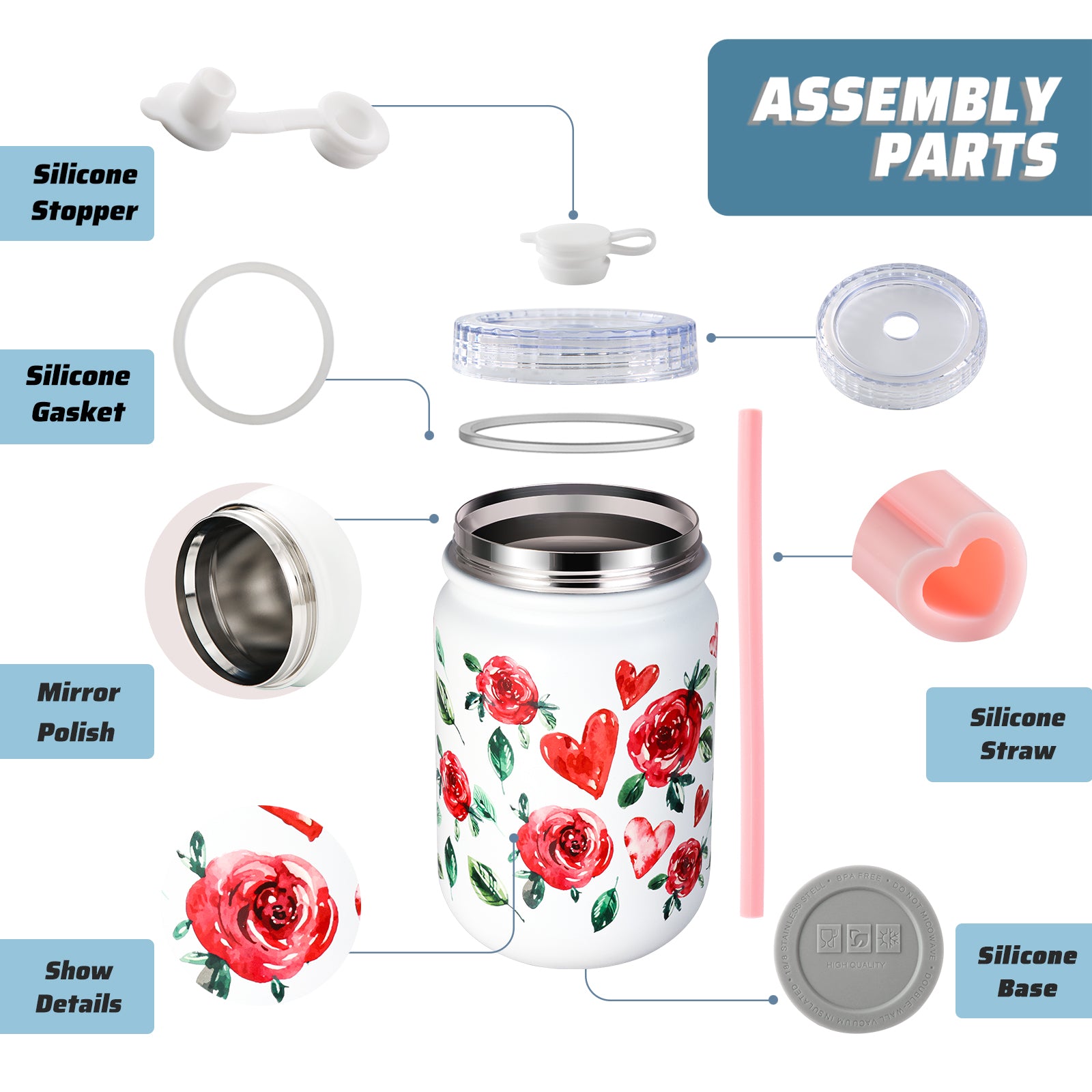 This cup contains a straw brush and heart shape silicone straw,All materials can pass LFGB test, BPA Free. All of our plastic accessories are reusable and recycle.Our portable and reusable cups can help reduce your carbon emissions.