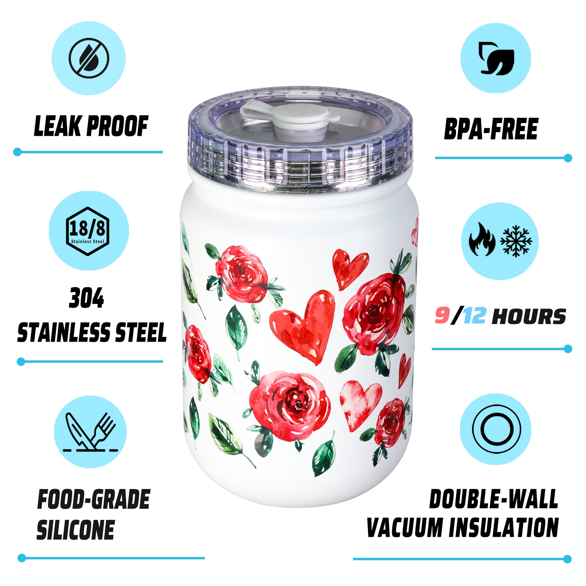 Vacuum insulation mason jar,used as food jar: murmioo mug is double-wall with copper,and vacuum insulated, which can keep your favorite drink cold for 9 hours and keep hot for 3 hours.including food, fruit, salad, milkshake, etc.; The sealing silicone plug hole in the mouth of the cup can prevent the outside temperature and provide better heat preservation.
